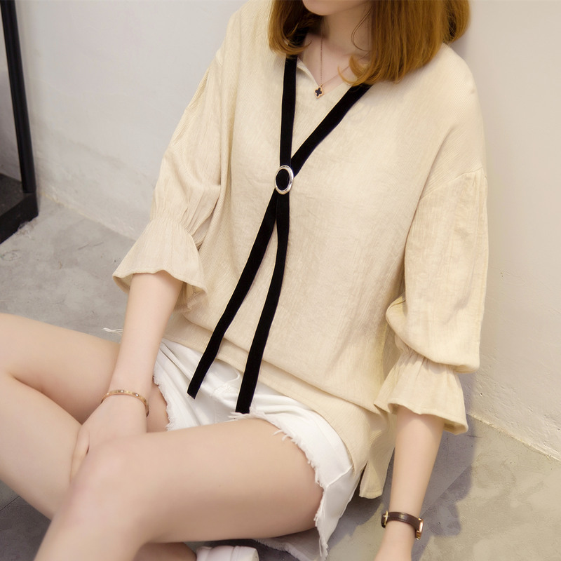 / 夏裝新款女裝韓版寬松荷葉袖打底體恤衫系帶春裝百搭女上衣潮