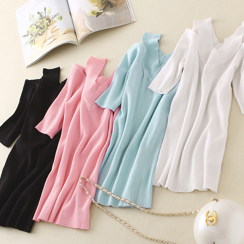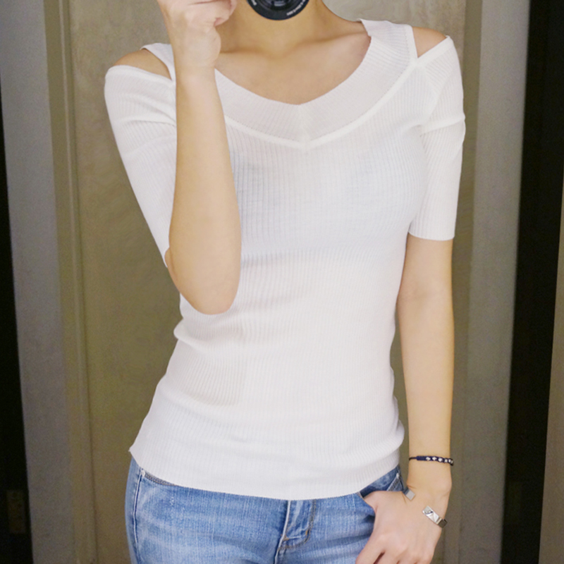 / 春季新款女裝針織衫女套頭中袖薄款短款v領修身顯瘦短袖針織T恤女