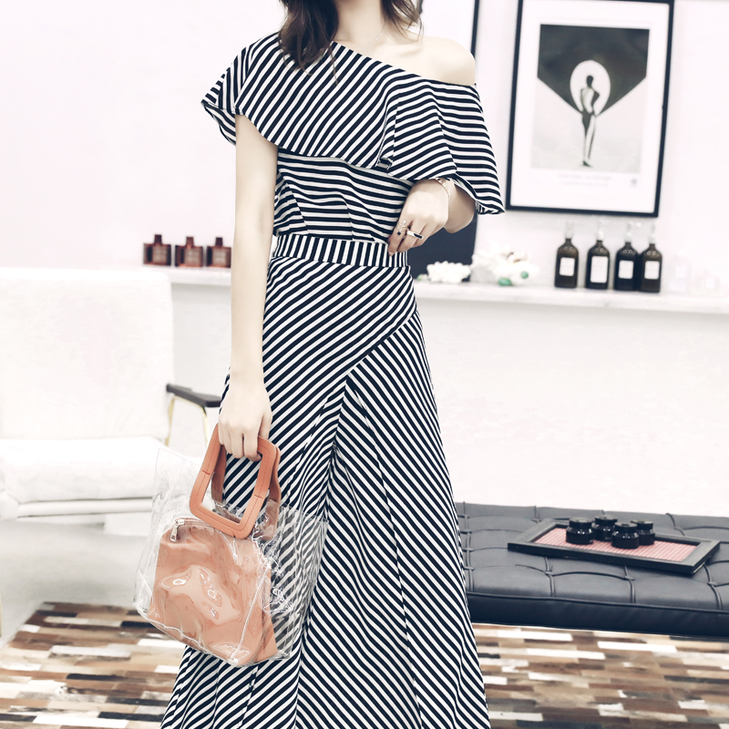 / 歐洲站2018夏裝新款女裝chic風條紋吊帶性感露肩上衣闊腿褲兩件套
