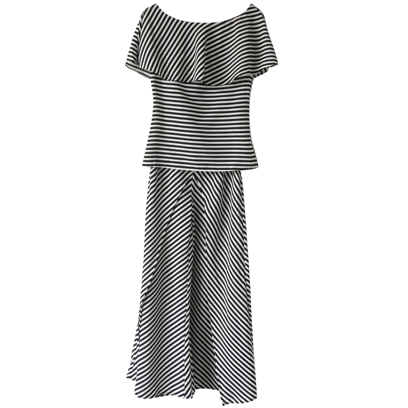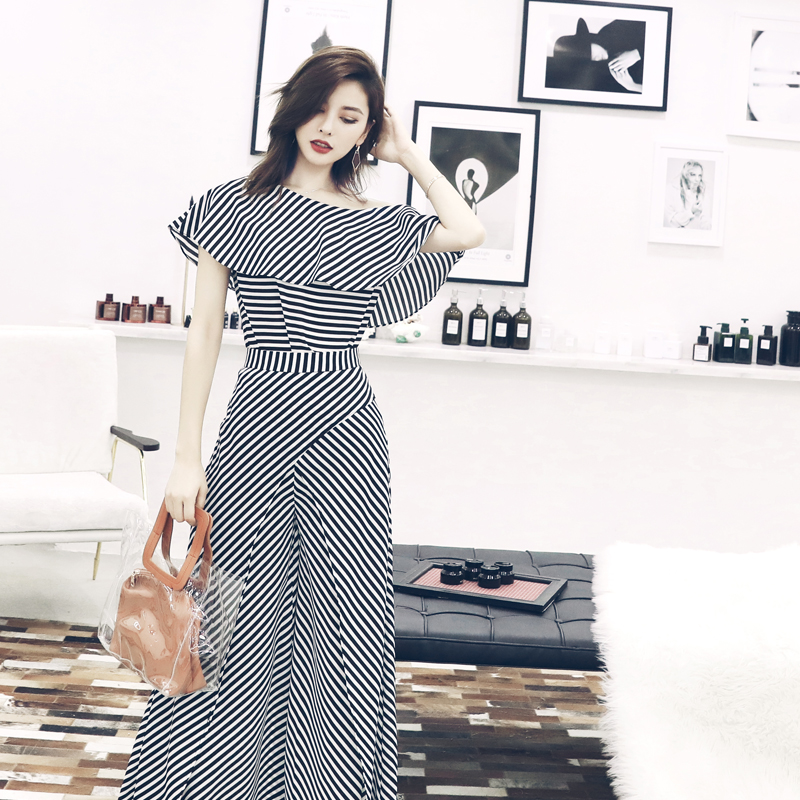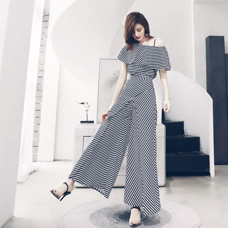 歐洲站2018夏裝新款女裝chic風條紋吊帶性感露肩上衣闊腿褲兩件套