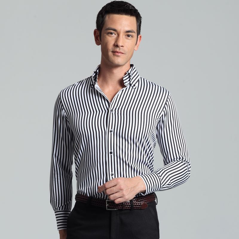 / 藍河豎條紋襯衫男長袖修身韓版秋裝純棉商務休閑男士修身襯衣男裝