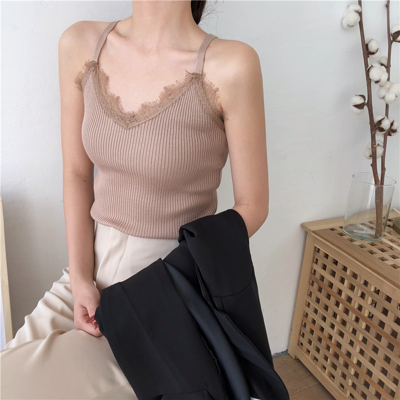 / 新款針織蕾絲吊帶韓版V領內搭修身顯瘦百搭復古chic風打底衫女夏