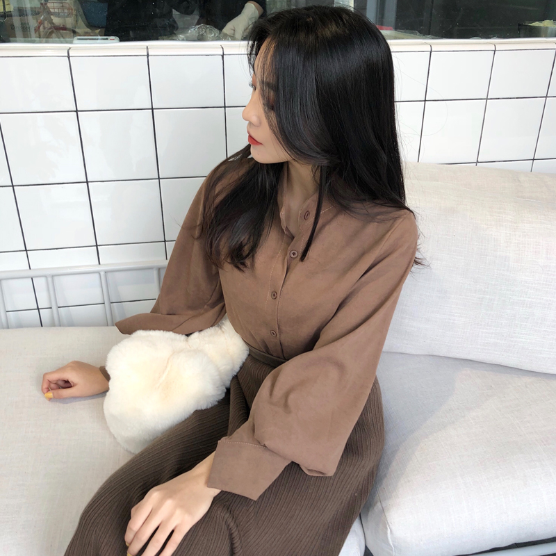 2018新款韓版港味復古立領單排扣寬松chic燈籠袖百搭襯衫女上衣潮