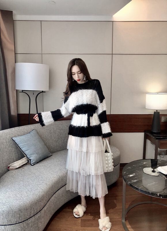 寬松長袖鏤空針織衫套頭外穿慵懶風條紋毛衣蛋糕裙時尚港風套裝女