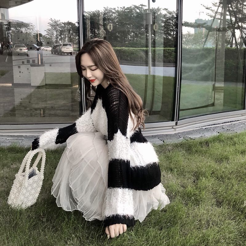 / 寬松長袖鏤空針織衫套頭外穿慵懶風條紋毛衣蛋糕裙時尚港風套裝女