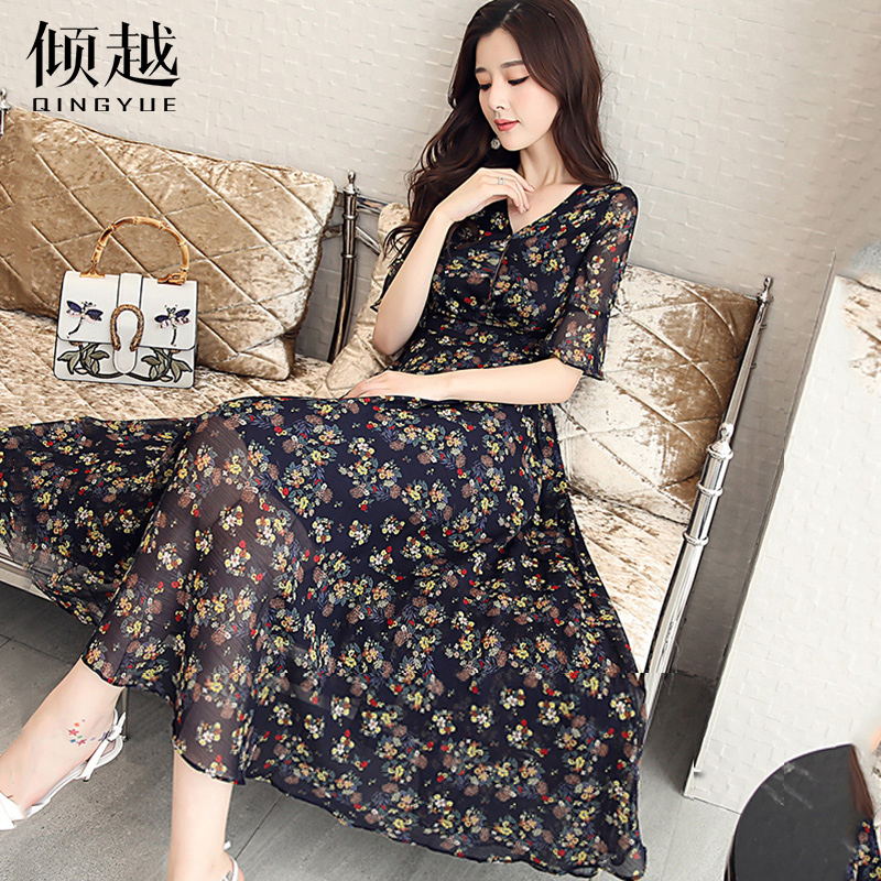 碎花雪紡連衣裙女裝長裙2017夏季新款時尚韓版顯瘦喇叭袖長款裙子