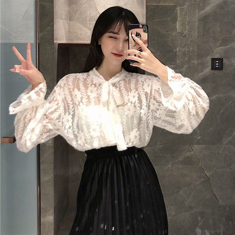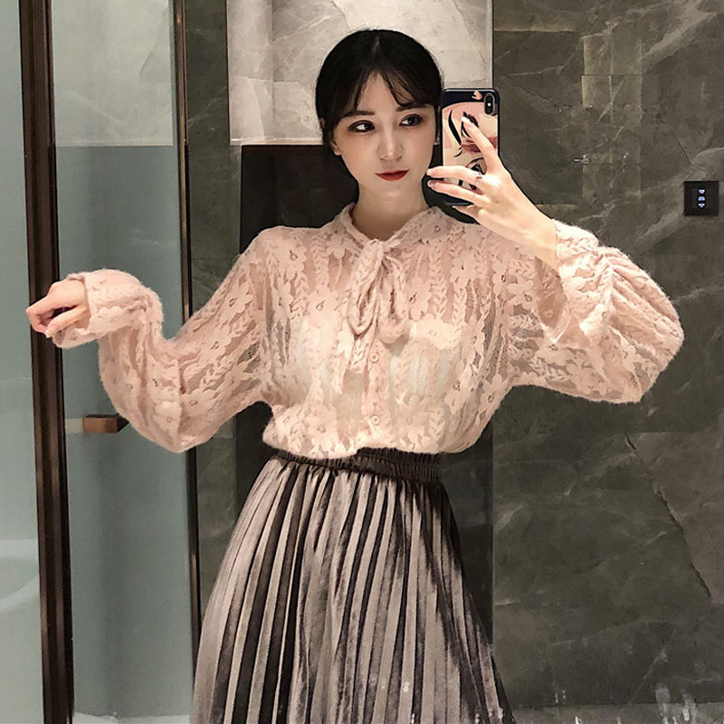 / 2018港味秋冬蕾絲仙女氣質打底襯衫優雅百褶絲絨半身裙時尚套裝潮