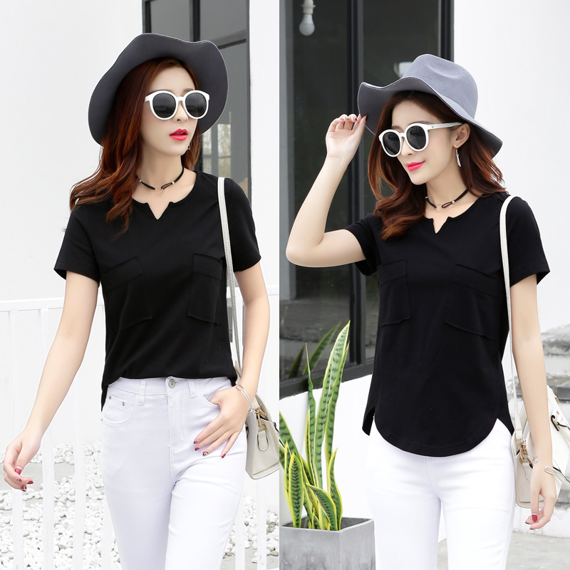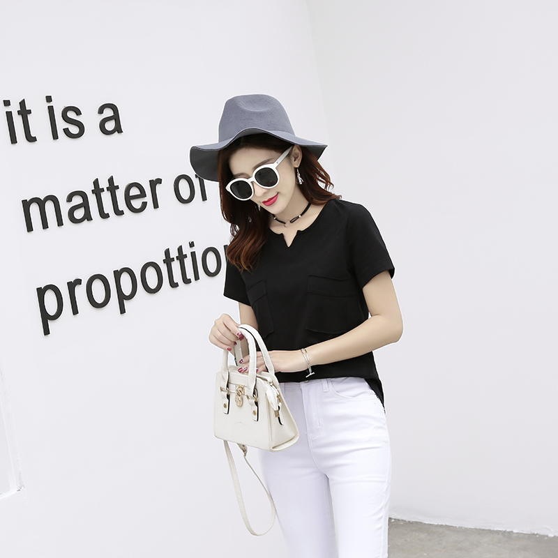 短袖T恤女韓版百搭寬松學生半袖純色打底衫開叉V領上衣夏季潮