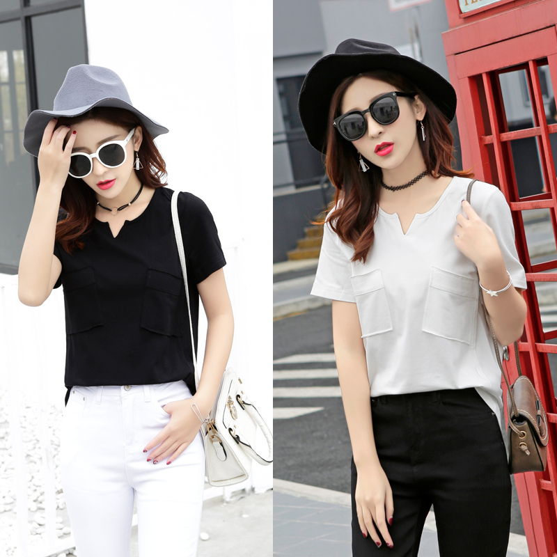 / 短袖T恤女韓版百搭寬松學生半袖純色打底衫開叉V領上衣夏季潮