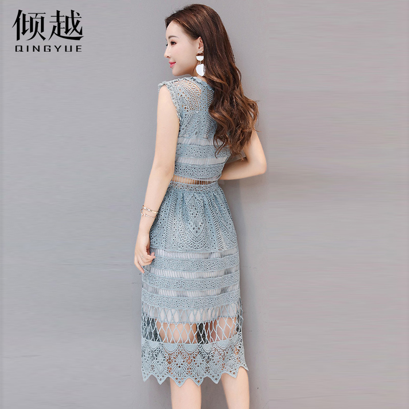 / 中長款連衣裙2017夏季韓版蕾絲繡花圓領百搭修身顯瘦女裝大擺裙潮