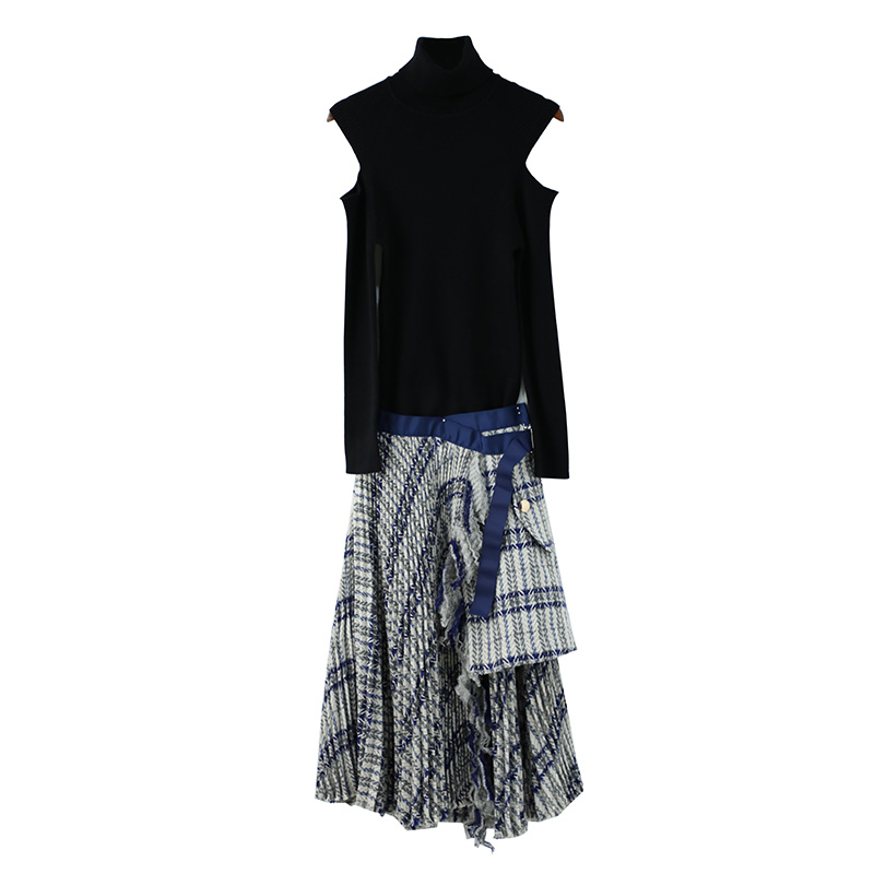 / 小清新高領露肩毛衣高腰毛呢半身裙子兩件套秋冬時尚氣質套裝裙