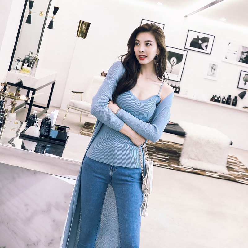 / 時尚套裝女牛仔小腳褲2018秋季新款中長款針織長袖開衫吊帶三件套