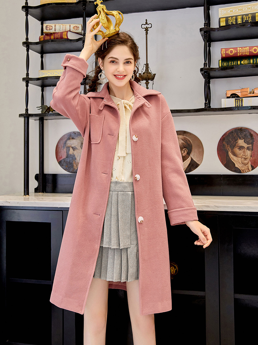 MG小象秋冬毛呢外套女中長款寬松2018新款蝴蝶結收腰粉色呢子大衣