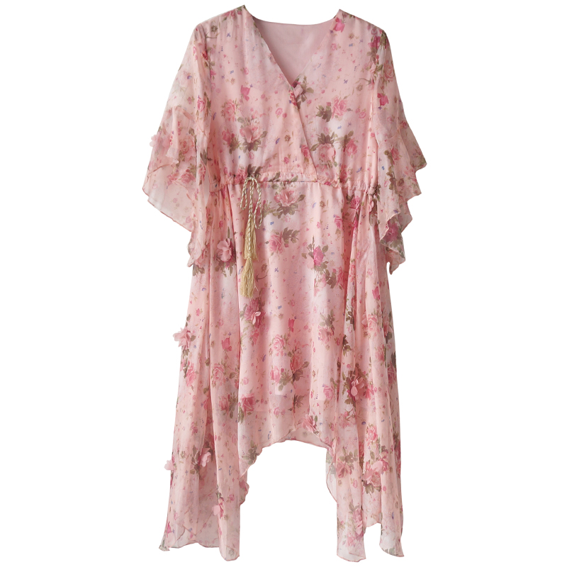 S秀時尚花色印花流蘇連衣裙女2018夏季新款時尚V領花瓣袖不規則裙