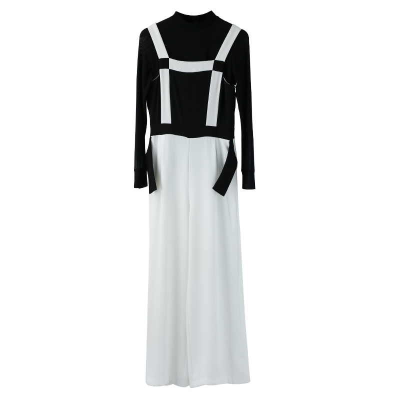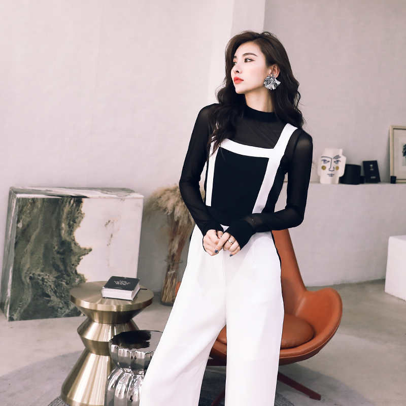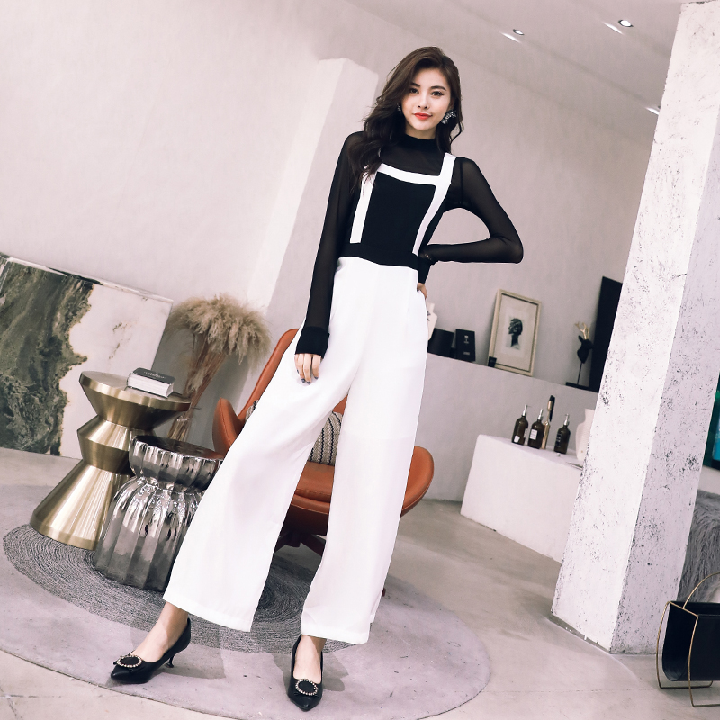 / 港味秋裝女2018新款t恤長袖上衣女工裝背帶褲闊腿褲兩件時尚套裝