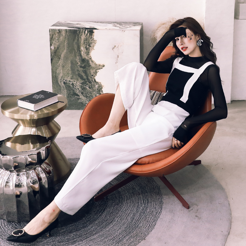 港味秋裝女2018新款t恤長袖上衣女工裝背帶褲闊腿褲兩件時尚套裝