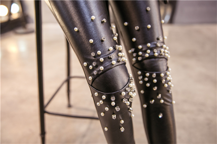 / 秋冬新款韓版加絨柳釘小腳褲皮褲顯瘦修身女裝彈力黑色打底褲