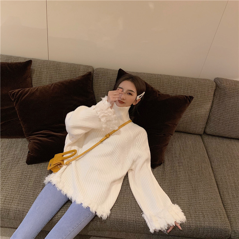 / 秋冬新款韓版時尚保暖甜美上衣慵懶寬松加厚高領拼接流蘇針織毛衣