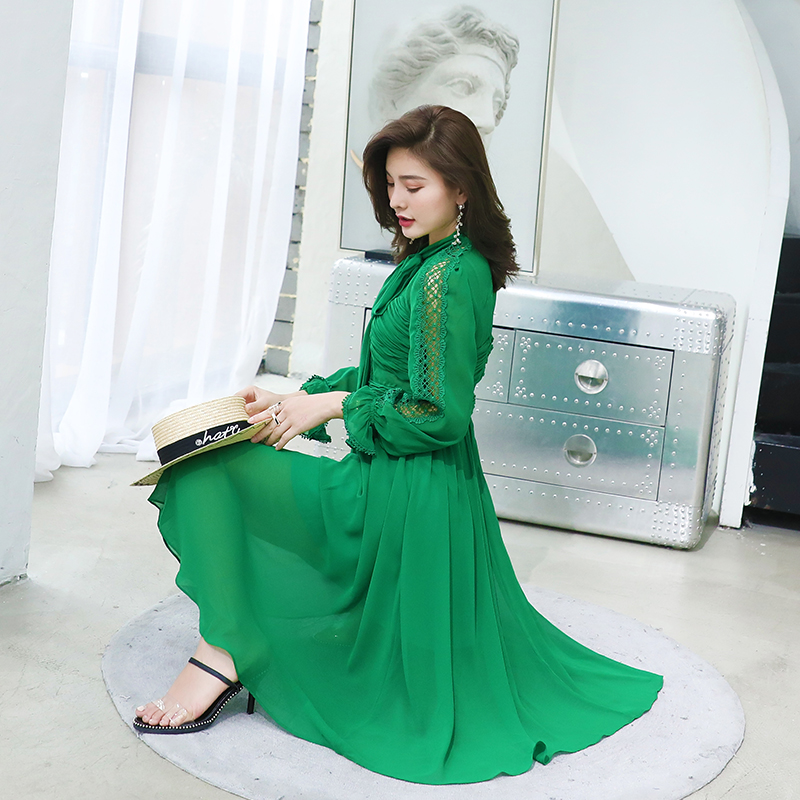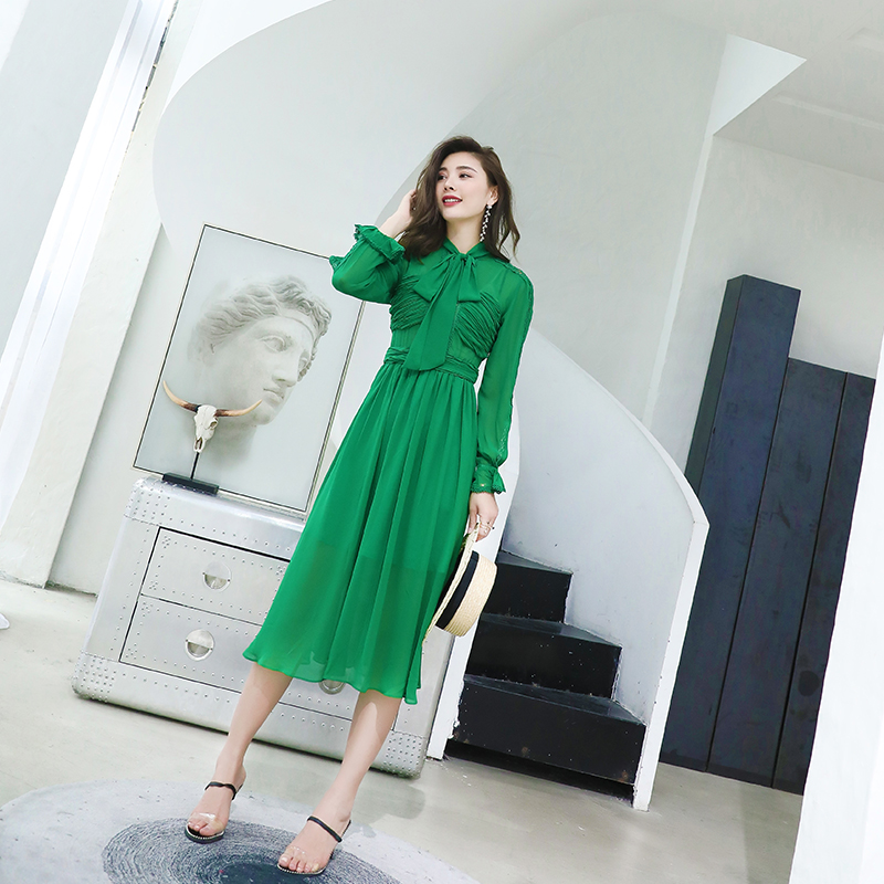 雪紡收腰長袖襯衫連衣裙2018新款秋女復古高腰純色甜美蝴蝶結裙子
