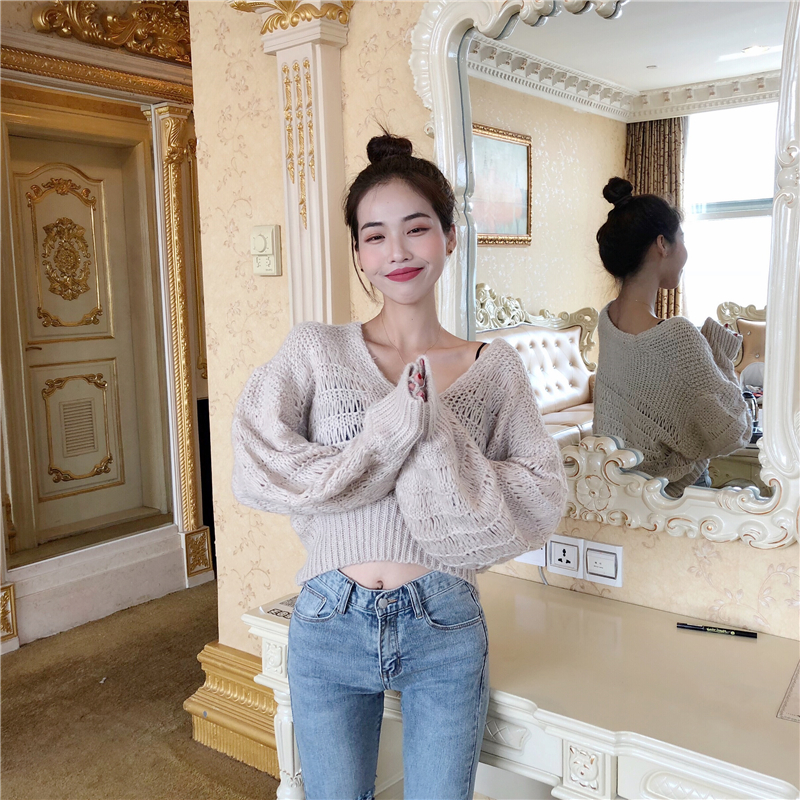 2018新款韓版秋裝上衣女短款百搭寬松V領燈籠袖針織衫慵懶毛衣潮