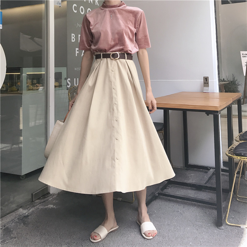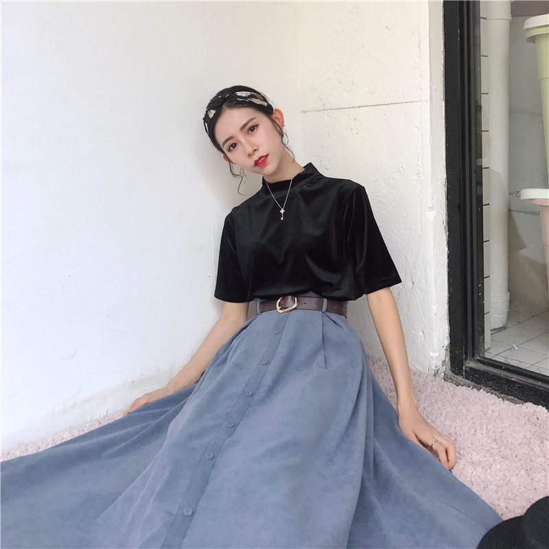 / 新款港味復古女純色百搭修身顯瘦上衣時尚學生休閑中長款裙送腰帶