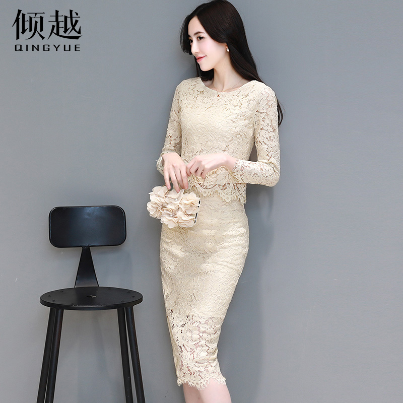 / 傾越2017年春季韓版兩件套裝裙長袖純色圓領蕾絲包臀打底連衣裙女
