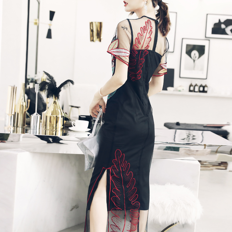 / 連衣裙2018夏新款女裝網紗拼接刺繡超仙長裙潮氣質修身顯瘦潮裙子