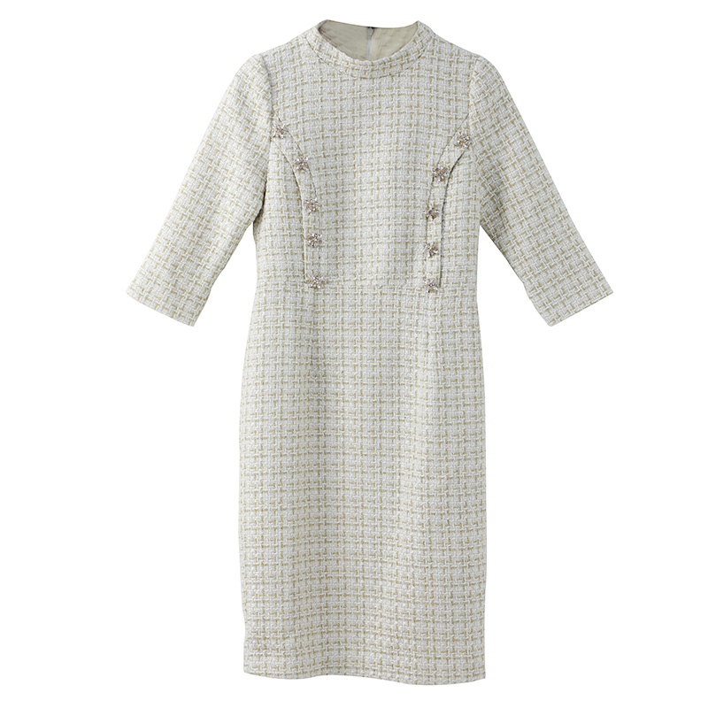 / 秋裝女2018新款毛呢格子連衣裙長袖毛衣釘珠小香風修身粗花呢裙子