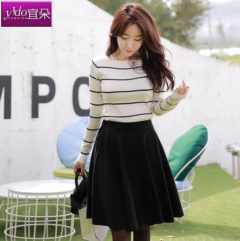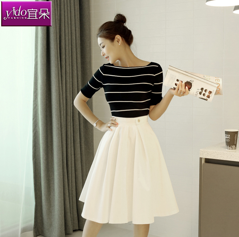 / 黑白條紋針織衫女短款春女裝中袖修身打底衫針織衫t恤女春季外穿