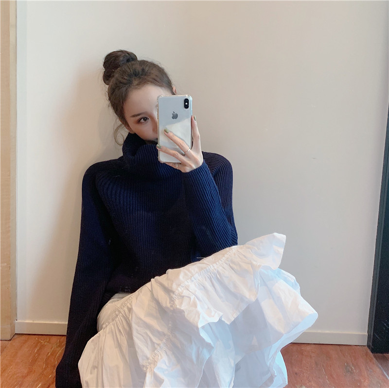 復古新款韓版針織衫女裝chic寬松顯瘦長袖百搭糖果色包堆堆領毛衣