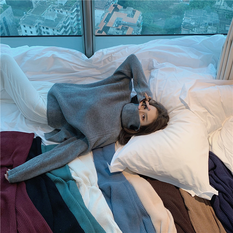 / 復古新款韓版針織衫女裝chic寬松顯瘦長袖百搭糖果色包堆堆領毛衣