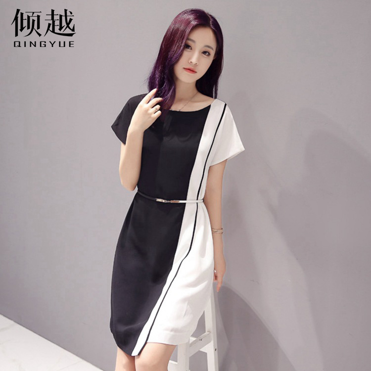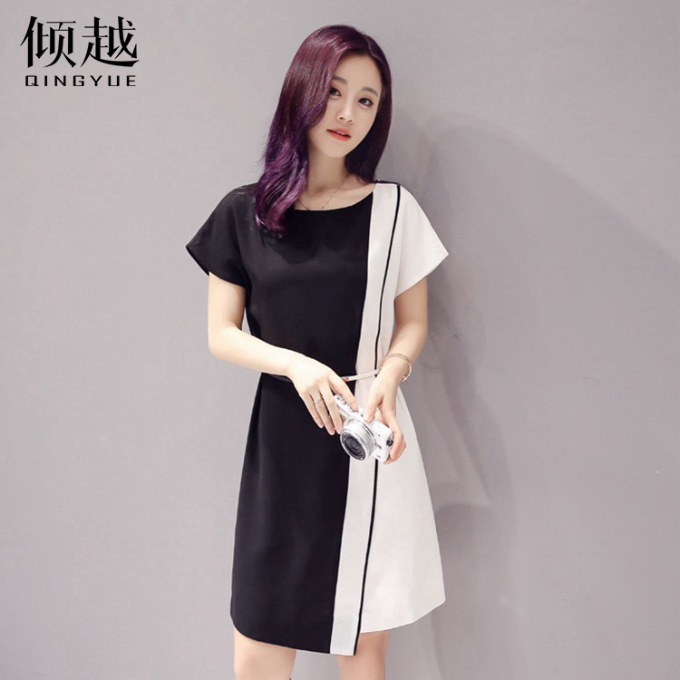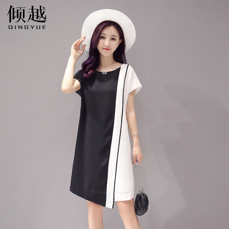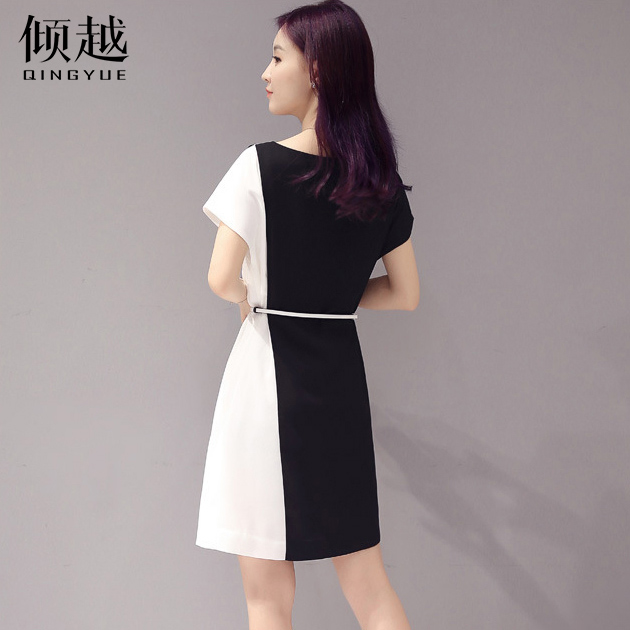 / 傾越2017夏季新款歐版大碼女裝修身雪紡撞色拼接短袖中長款連衣裙