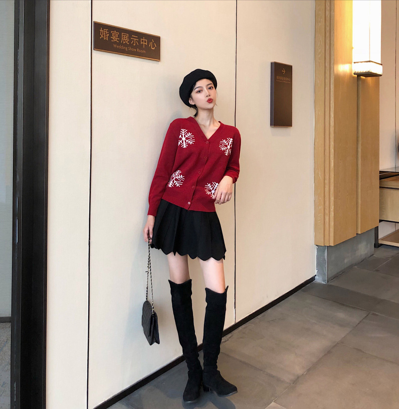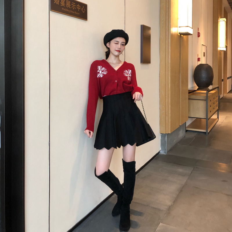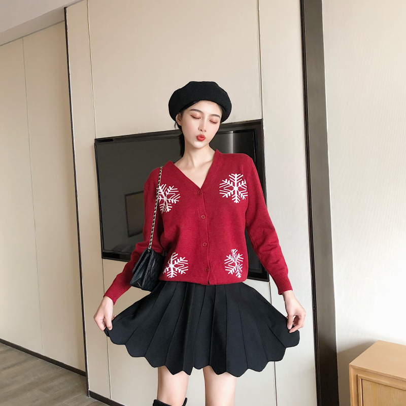 2018秋冬新款韓版chic修身百搭雪花針織衫開衫高腰半身裙時尚套裝