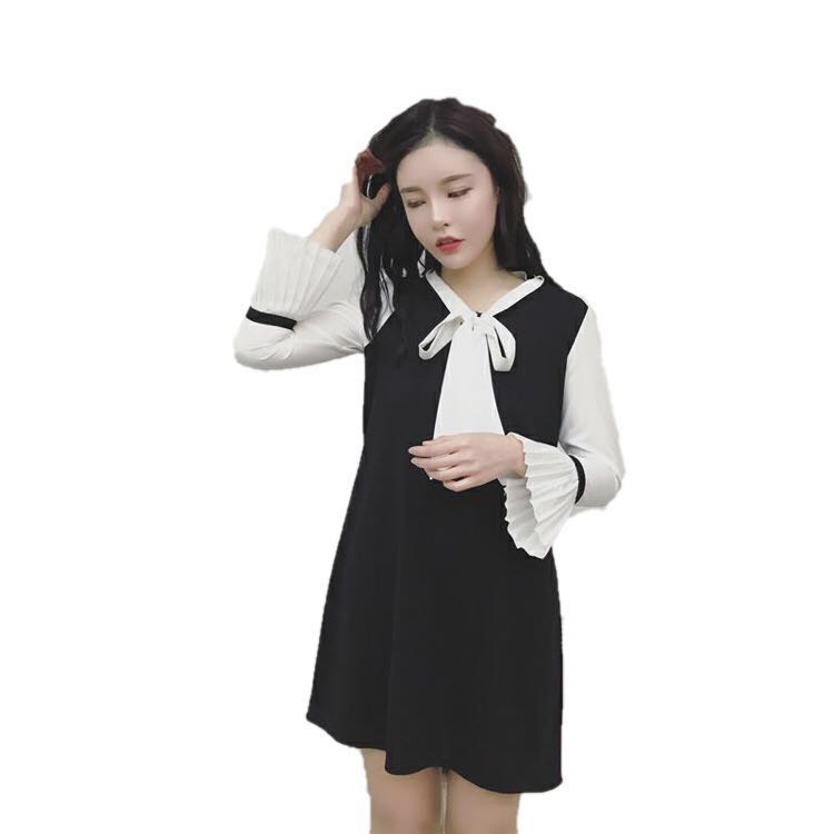 / 港味時尚新款韓版秋季假兩件系帶蝴蝶結黑白拼色喇叭袖連衣裙女潮