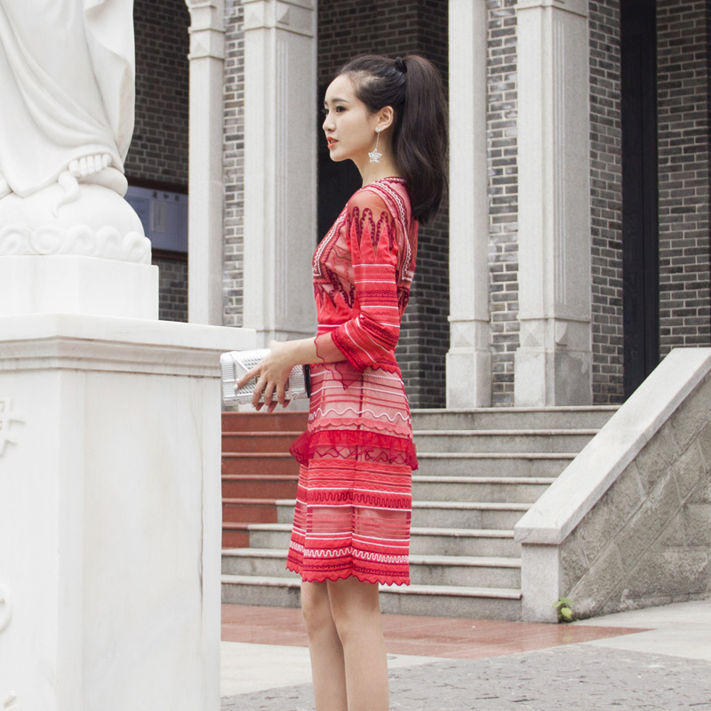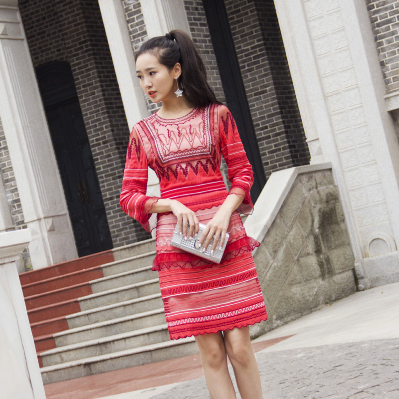 / 2018韓版春季新款名媛氣質修身顯瘦連衣裙圓領七分袖花邊裙子女潮