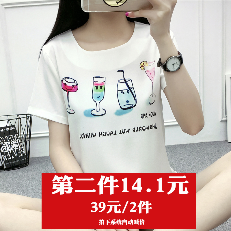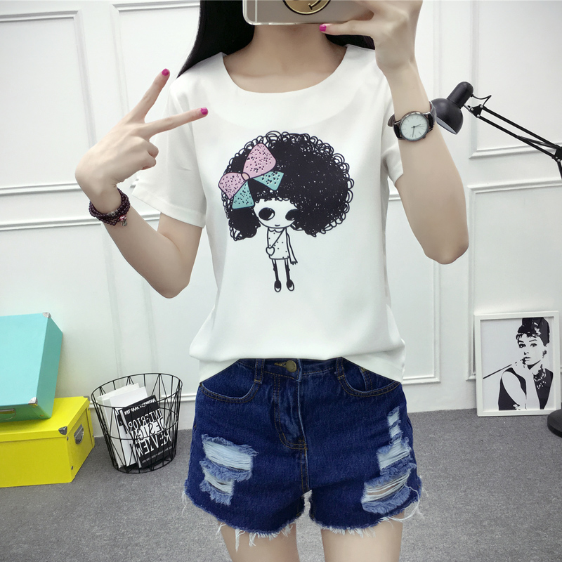 / 夏季新款雪紡衫短袖T恤女韓版寬松大碼百搭學生印花雪紡上衣