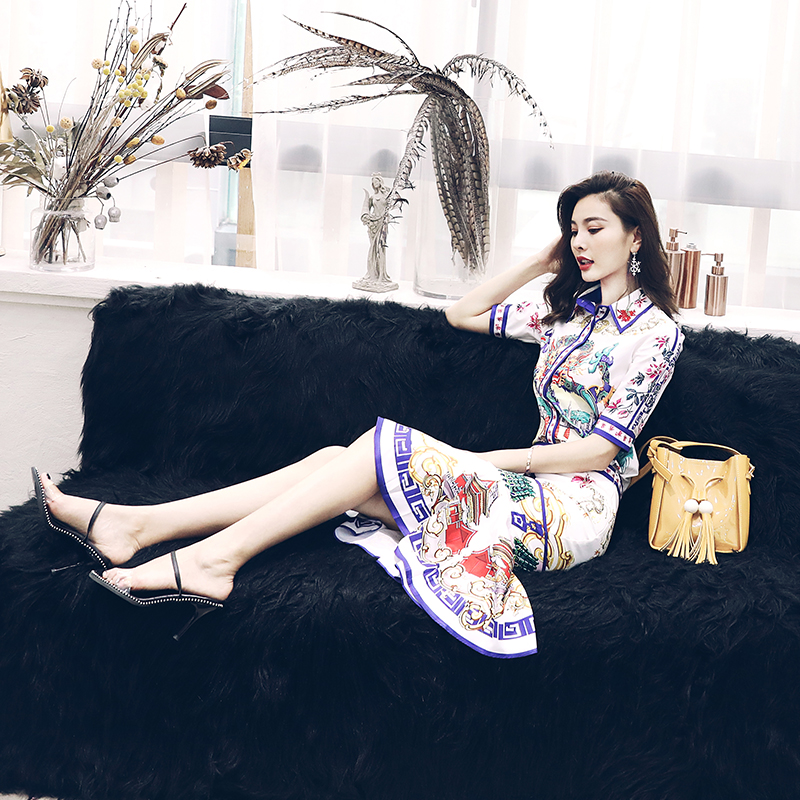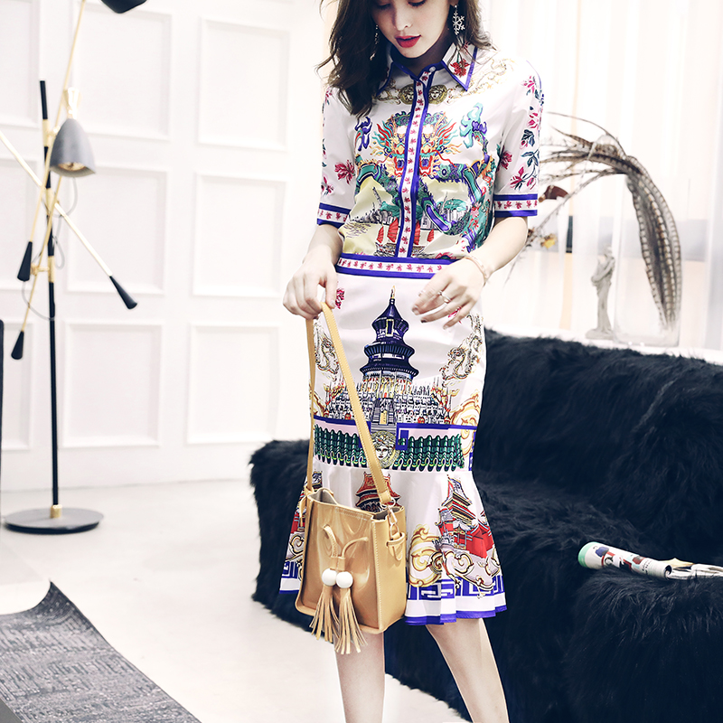 S秀2018女夏季新款印花裙子兩件套中長款魚尾裙半身裙套裝