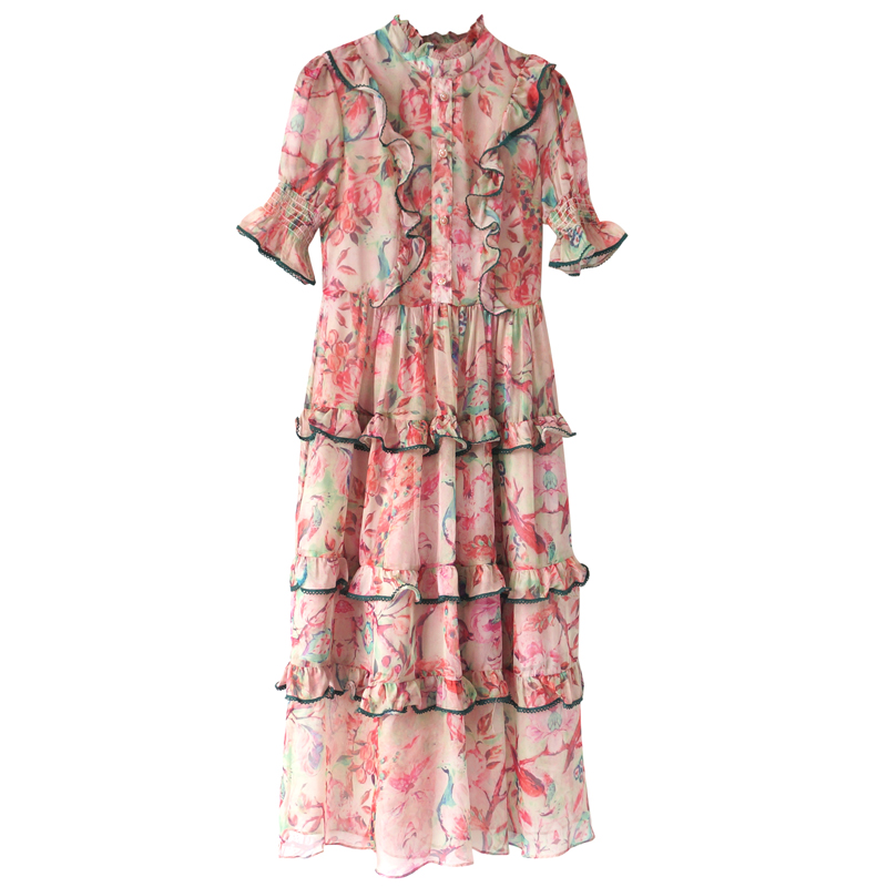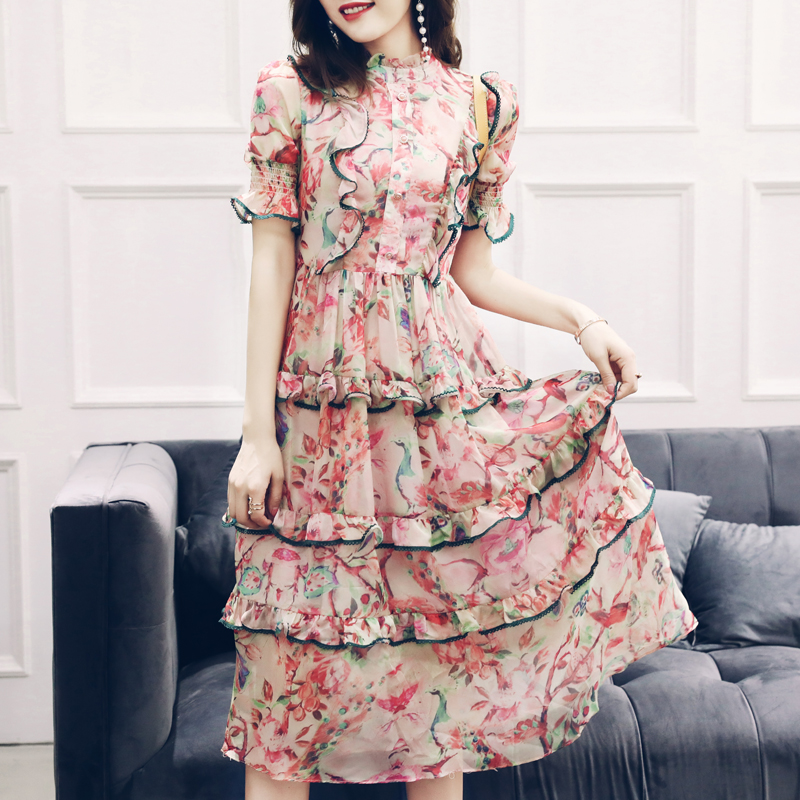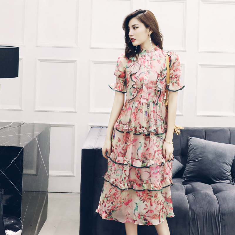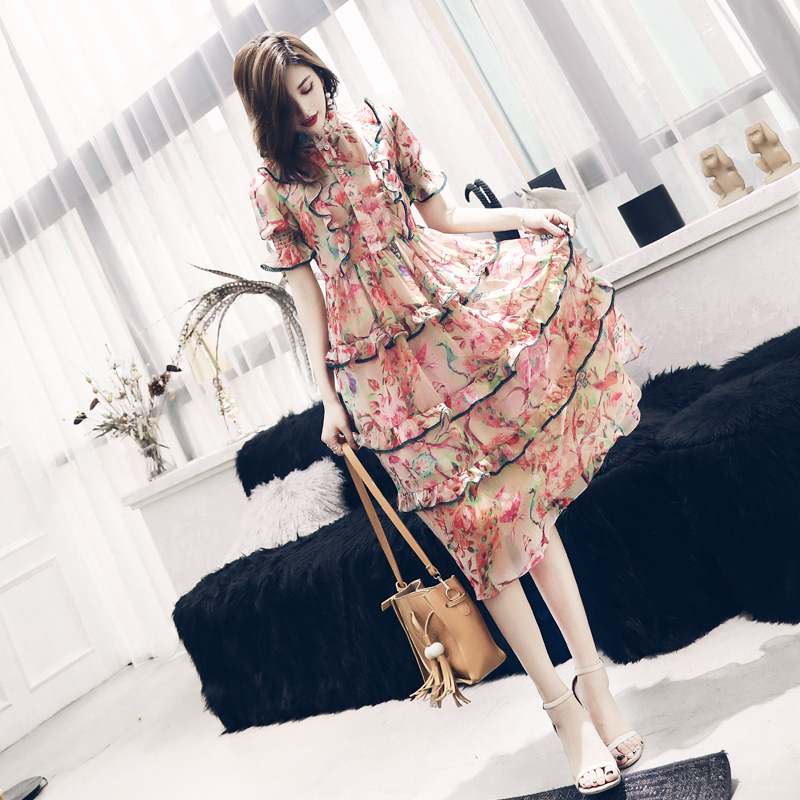 S秀淑女氣質連衣裙夏季2018新款中長款收腰氣質拼接荷葉邊長裙