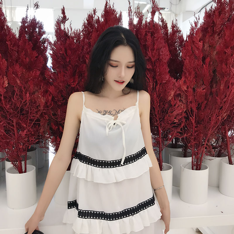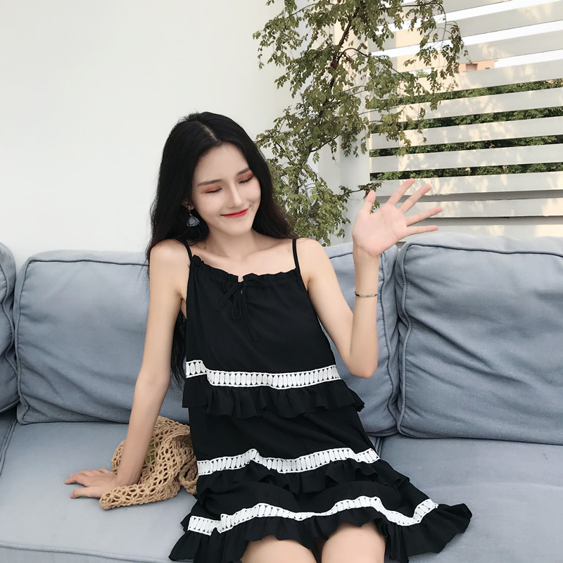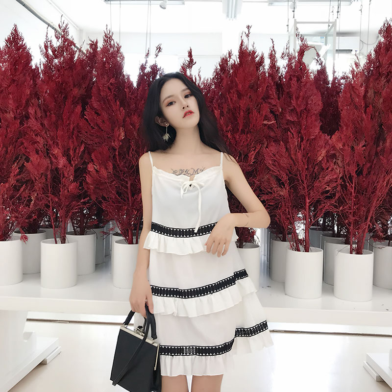 / 韓版小清新層層荷葉邊蛋糕裙甜美復古chic顯瘦露肩吊帶雪紡連衣裙