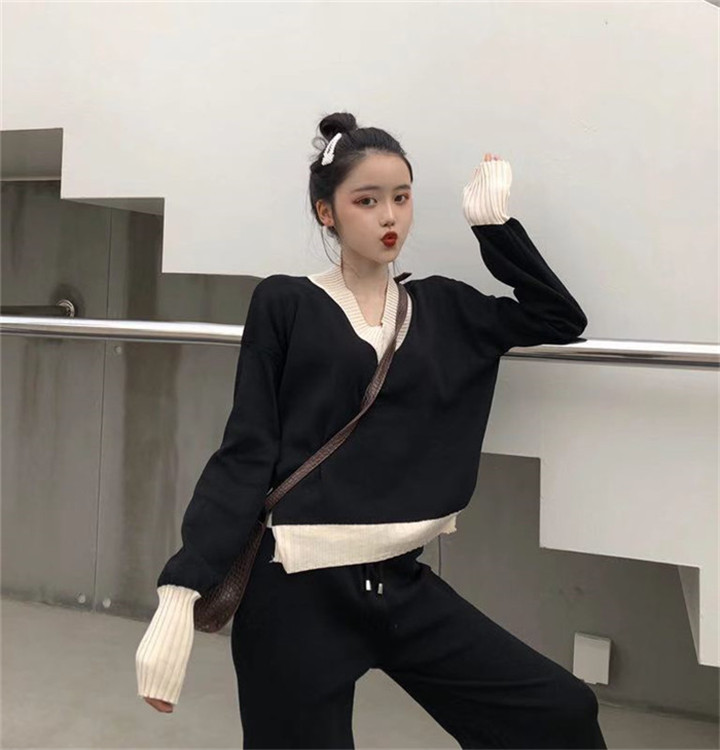 新款韓版拼色V領寬松針織衫上衣時尚套裝高腰闊腿休閑褲兩件套女