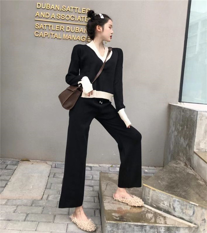 / 新款韓版拼色V領寬松針織衫上衣時尚套裝高腰闊腿休閑褲兩件套女