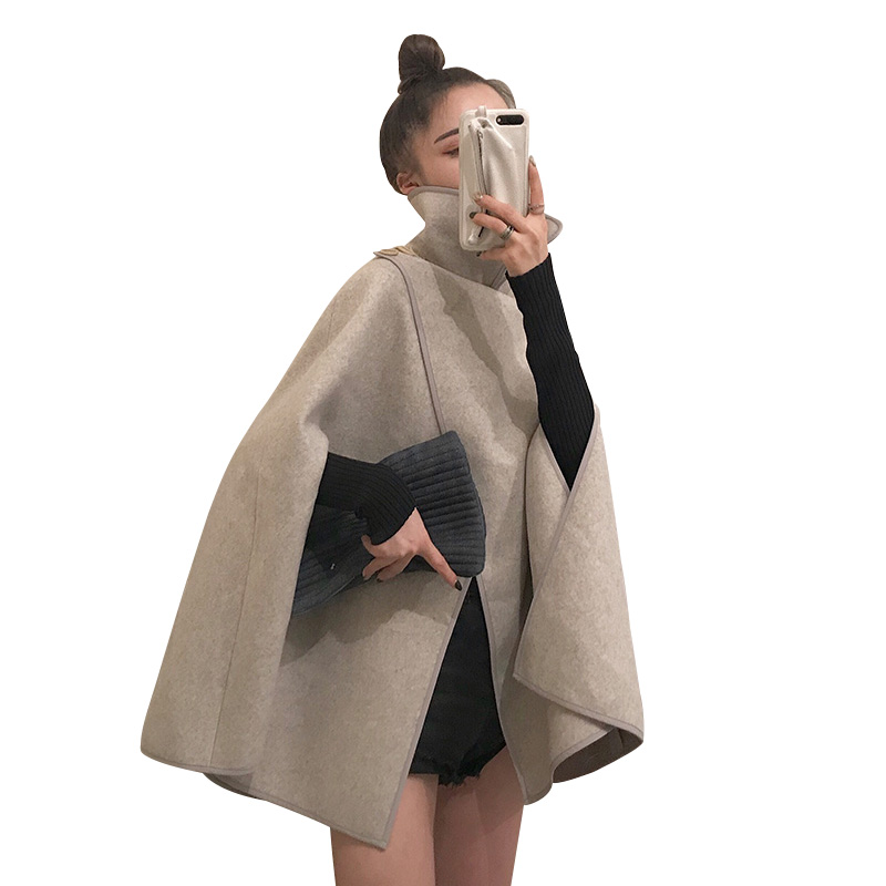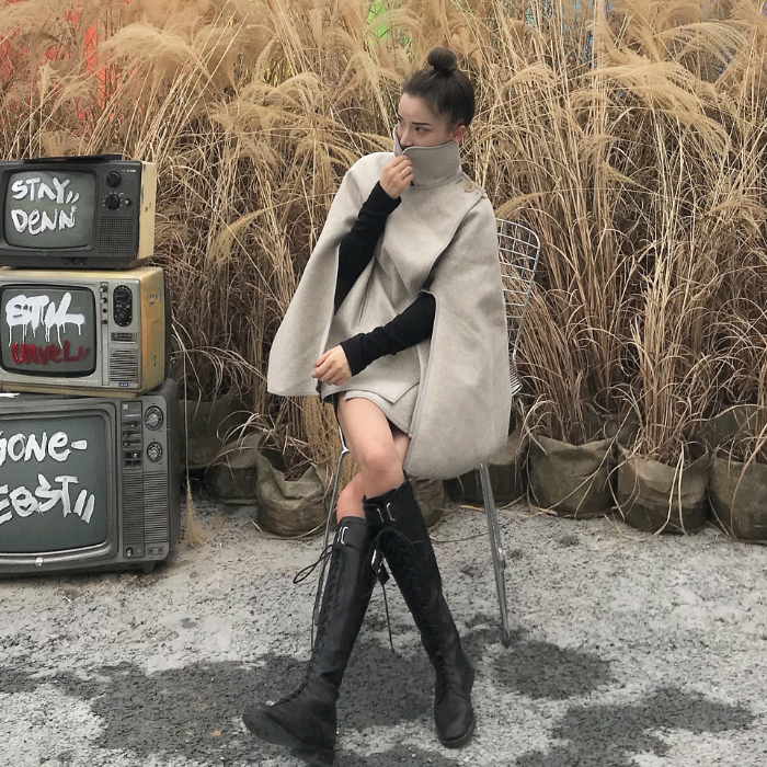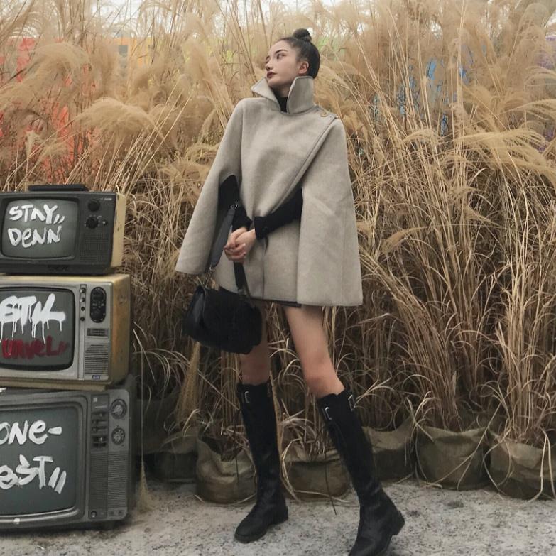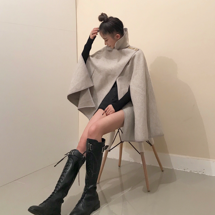 / 新款時尚套裝寬松斗篷短款呢子外套百搭純色針織打底衫chic兩件套