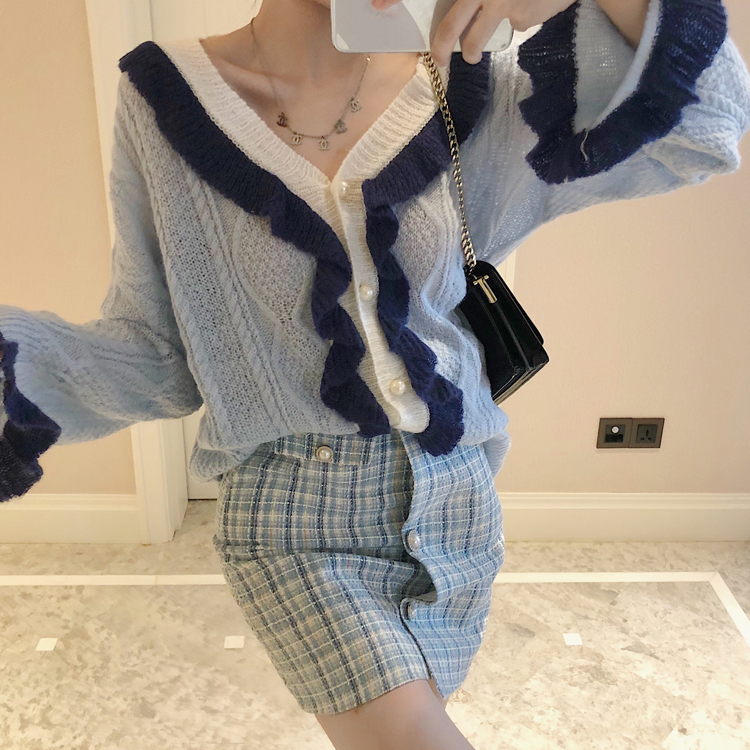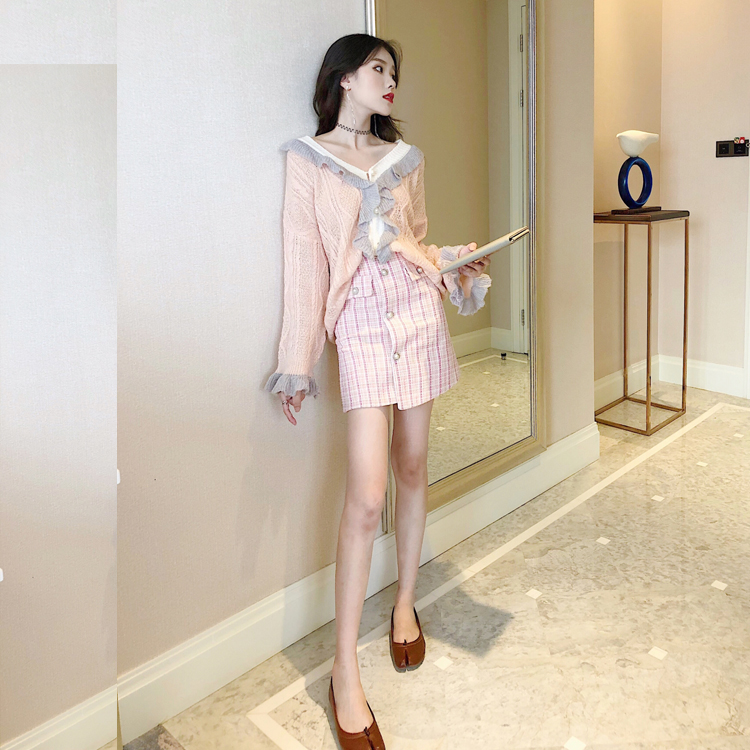 / 2018秋裝新款韓版港風時尚套裝荷葉邊V領開衫粗花呢氣質格子半裙