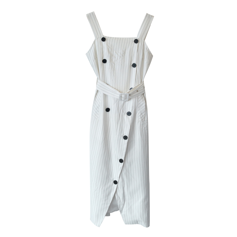2018夏季新款韓版修身條紋復古一字肩顯瘦高腰吊帶中長款女連衣裙