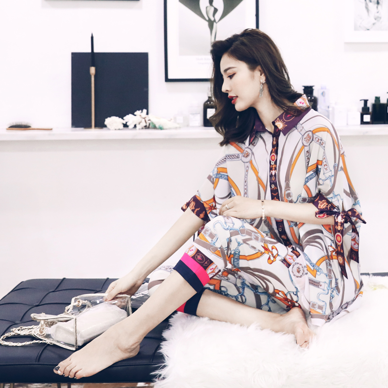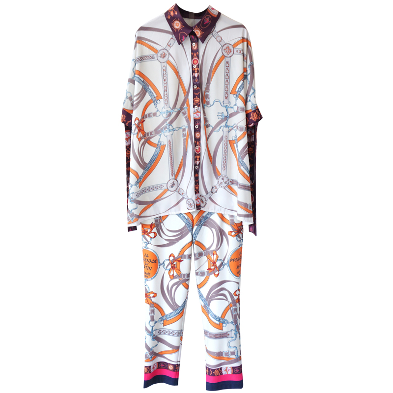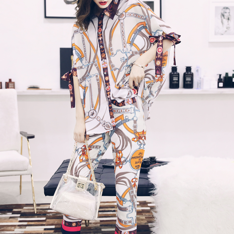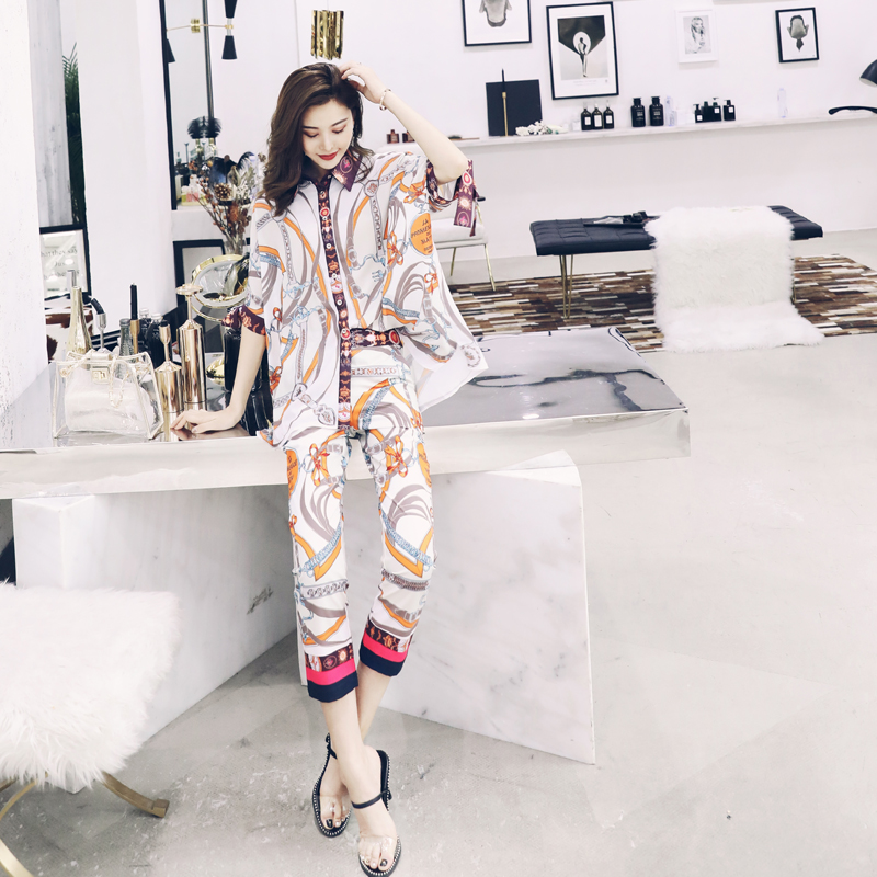/ 歐洲站名媛氣質五分袖洋氣中袖襯衫上衣印花小腳褲時尚套裝兩件套