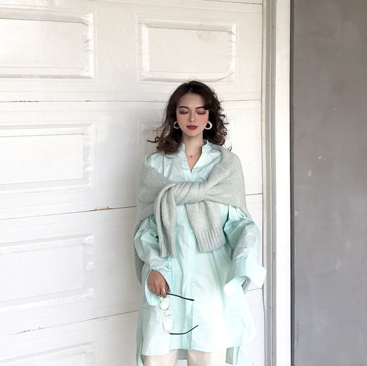 很獨特的清新感 吧毛衣搭在肩上跟披巾一樣搭配