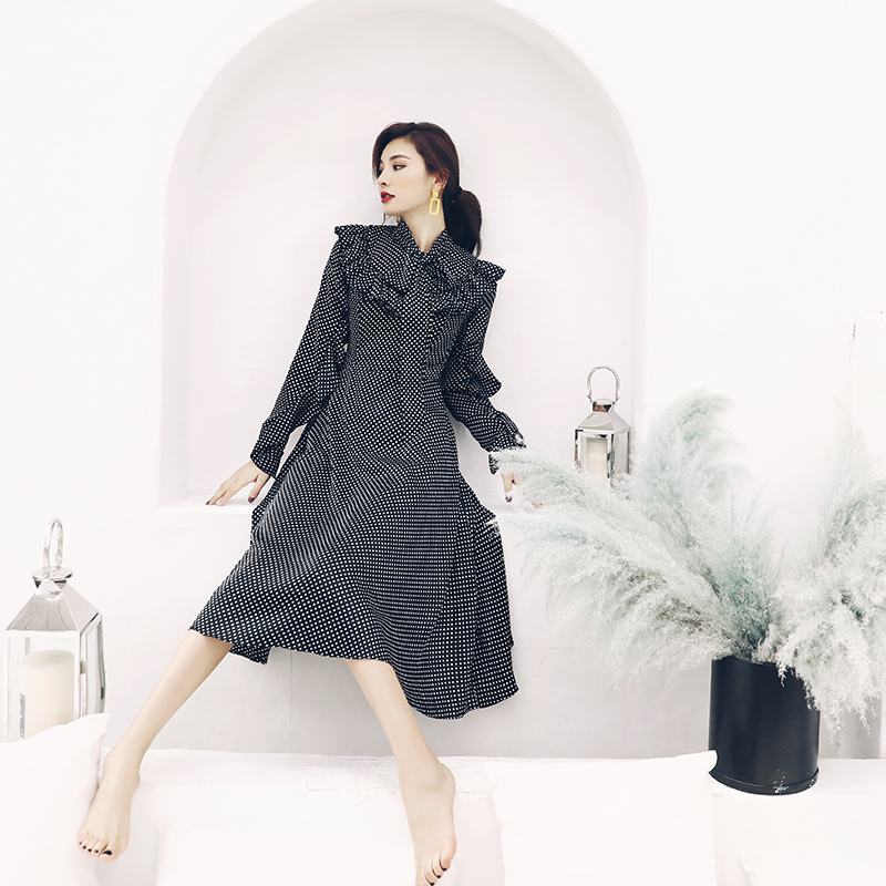 / 名媛氣質早秋網紅同款波點長袖連衣裙韓版收腰中長款內搭打底裙子