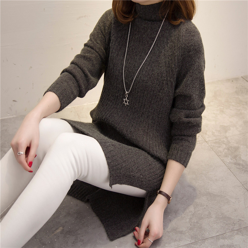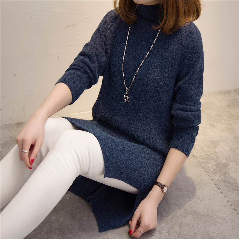 / 半高領冬季女裝中長款開叉韓版長袖毛衣女套頭純色加厚針織新款潮