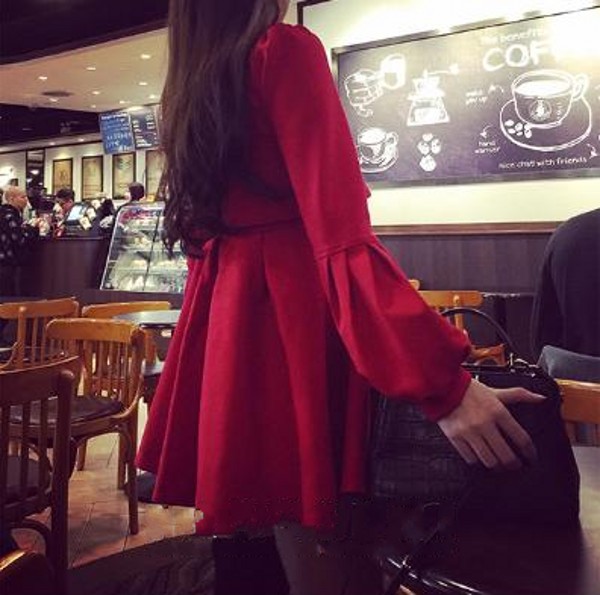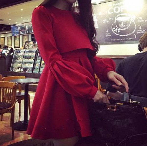/ 秋冬韓版氣質長袖燈籠袖修身顯瘦高腰套頭紅色連衣裙女裝短裙