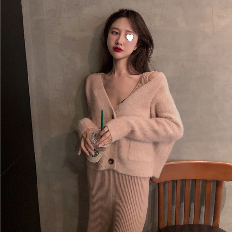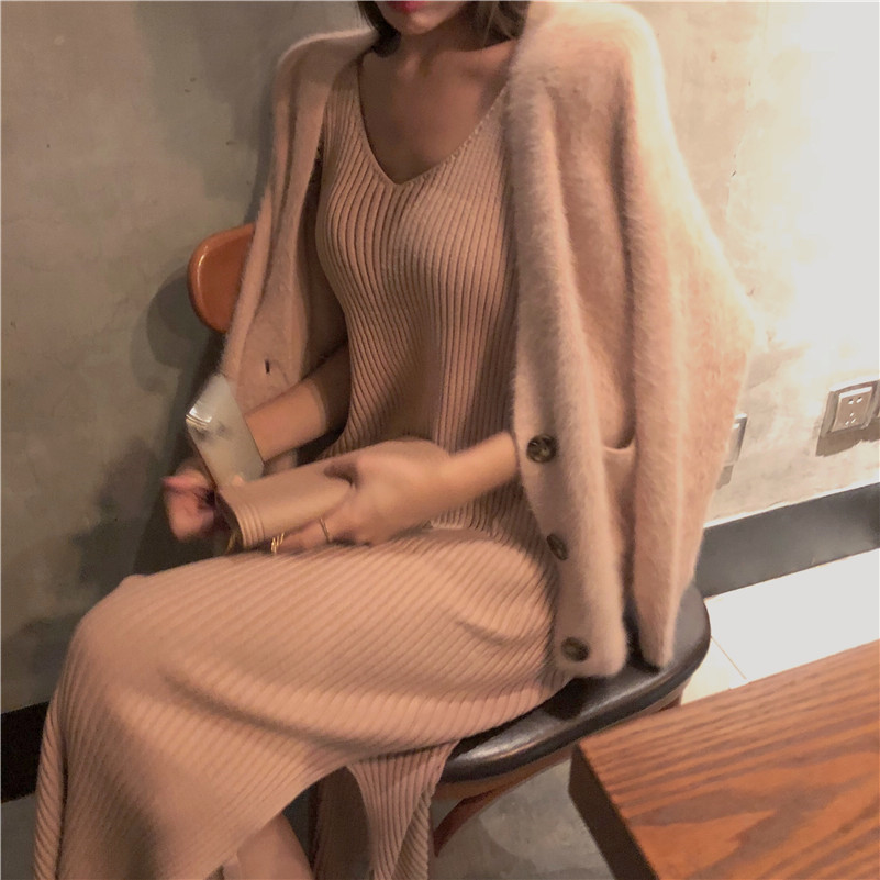 / 2018新款秋冬慵懶寬松短款chic百搭開衫長款內搭連衣裙毛衣兩件套